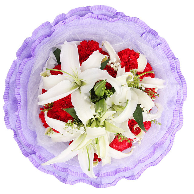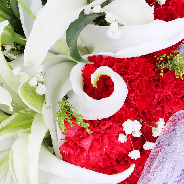 - 花材:19枝红色康乃馨,香水百合、满天星、黄莺