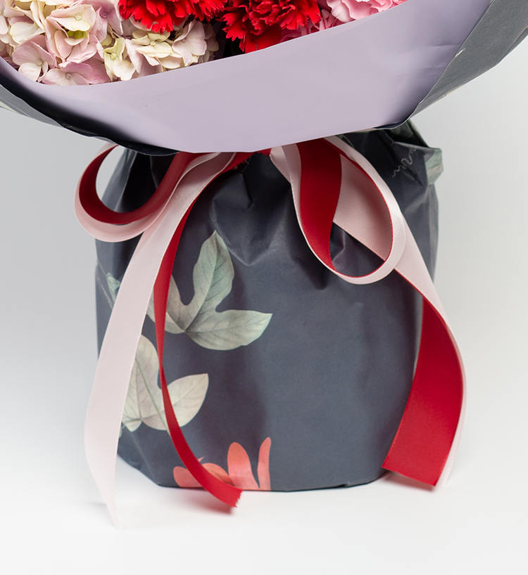 - 花材:红康乃馨10枝,粉色绣球1枝,红色多头玫瑰3枝,粉多头康乃馨5枝,栀子叶10枝,红豆10枝