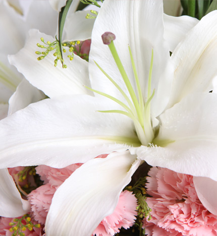 2枝多头白香水百合,19枝粉康乃馨,黄莺10枝